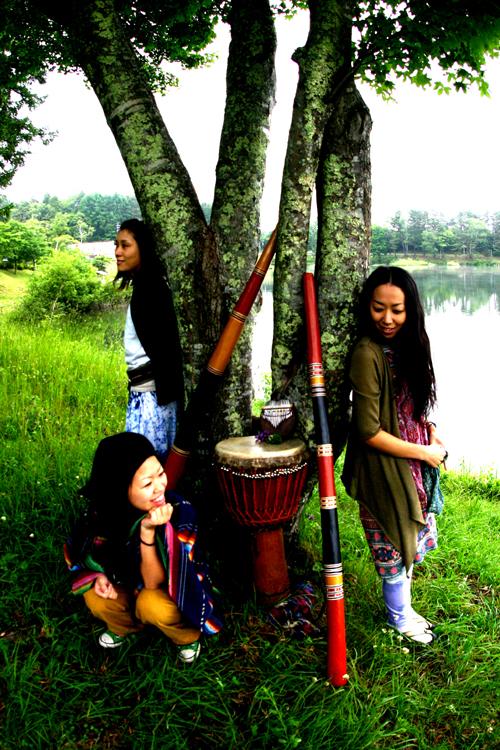 女性トリオ、Eri (Didjeridu/Vo), Lina (Didjeridu), Yuko (Percussion) 様々な民族楽器を使い、聴く人を創造と癒しの幻想的な空間に飲み込んでゆく。